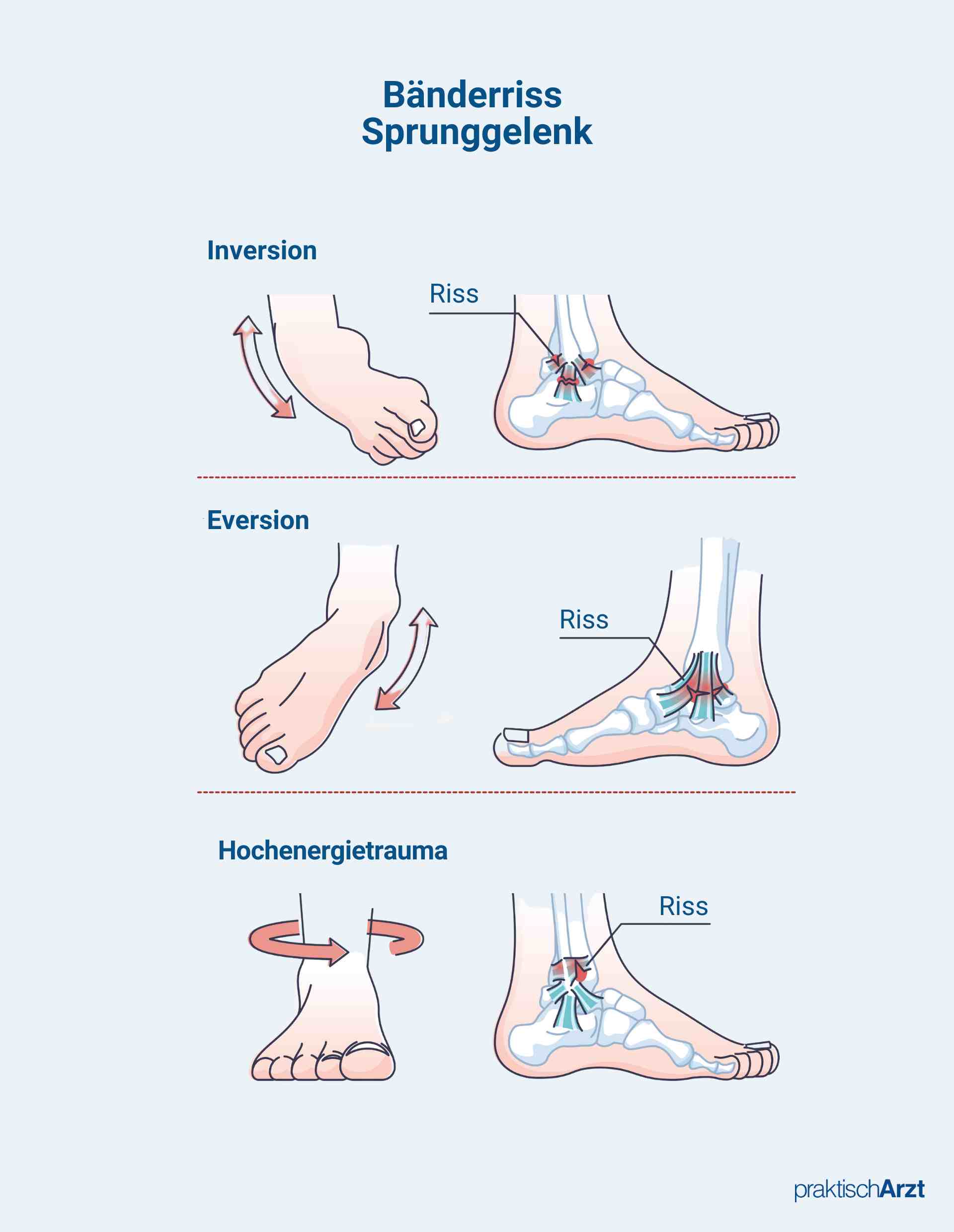 In 85 Prozent aller Fälle entsteht ein Bänderriss am Sprunggelenk, wenn der Fuß umknickt oder übermäßig gedreht wird. Ein oder mehrere Bänder halten der plötzlichen Torsion bzw. dem Aufprall nicht stand und reißen. Bänderrisse am Sprunggelenk können aber auch durch Fehlbelastungen oder schwache bzw. verkürzte Muskeln und Sehnen oder Nervenschäden entstehen.